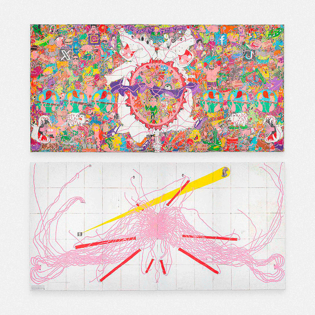 The residue ceases to be leftover and becomes structure. Edges of canvas, fragments, and seemingly secondary decisions take over the space and reorganize it. Painting no longer contains itself; it expands, folds, and spills into the architecture, altering the way the body moves through space. What once framed now occupies. What once seemed accidental now determines.