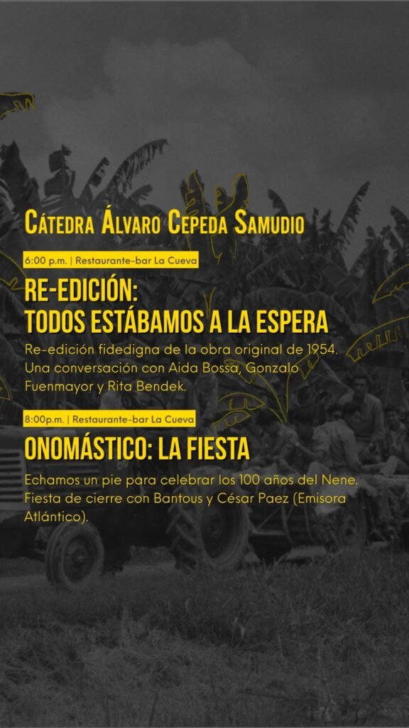 6:00 p.m. – 7:00 p.m. Re-edición: Lanzamiento de Todos estábamos a la espera Lanzamiento de la re-edición fidedigna de la obra original de 1954 con ilustraciones de Gonzalo Fuenmayor. Conversación entre Aida Bossa, Gonzalo Fuenmayor y Rita Bendek.