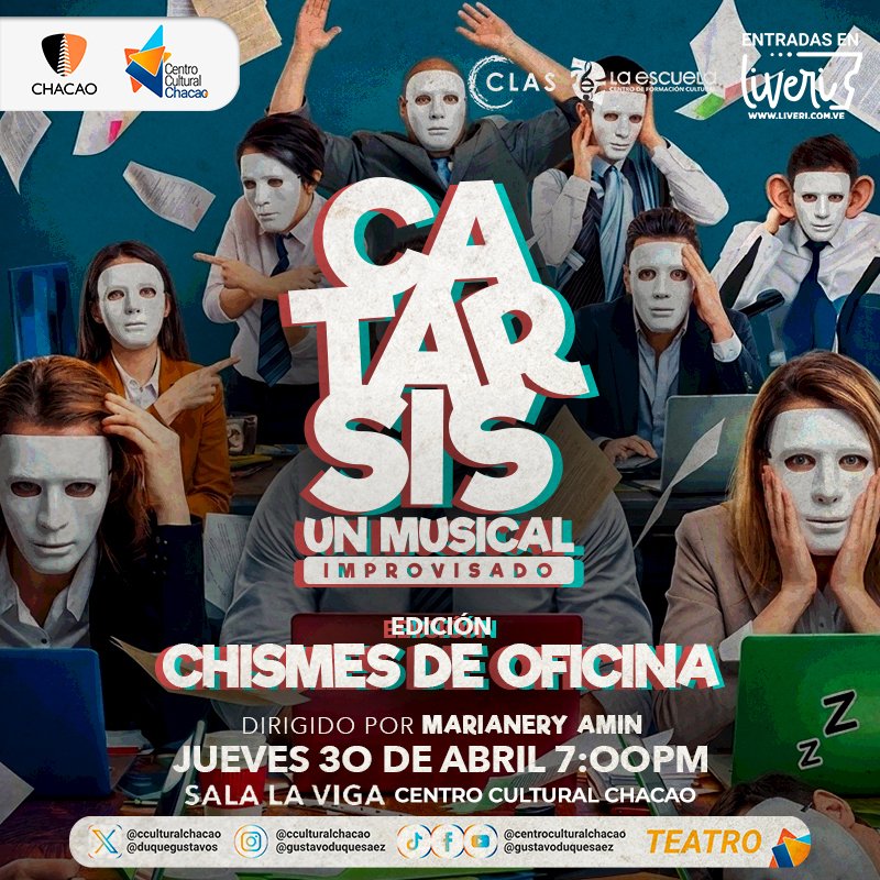 El próximo jueves 30 de abril a las 7:00 p.m., la Sala La Viga del Centro Cultural Chacao recibirá el espectáculo «Catarsis, Edición Chismes de Oficina», una experiencia teatral única donde las anécdotas y dramas laborales del público se convierten en un musical creado totalmente en vivo. En este show, los asistentes podrán liberar el peso de sus recuerdos de oficina, compartiendo sus historias con un elenco de actores, cantantes e improvisadores que, en ese mismo instante, compondrán canciones, coreografías y tramas épicas. Las entradas están a la venta en las taquillas de Cinex, el Centro Cultural Chacao y en la plataforma www.liveri.com.ve, contando además con un descuento especial para estudiantes que presenten su carnet vigente únicamente en la taquilla física del centro cultural.