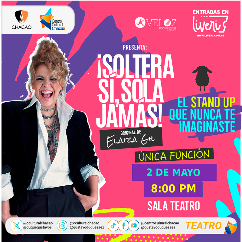 El próximo sábado 2 de mayo a las 8:00 p.m., la sala principal del Centro Cultural Chacao recibirá a la polifacética actriz, directora y productora Elaiza Gil con su espectáculo unipersonal «Soltera Sí, Sola Jamás», una propuesta ingeniosa y distinta a todo lo que ha presentado anteriormente. En esta pieza, Gil comparte anécdotas inimaginables de su carrera y aborda con honestidad la experiencia de ser una mujer plenamente feliz, sin hijos y soltera en el siglo XXI, enviando un mensaje cargado de optimismo y empoderamiento.