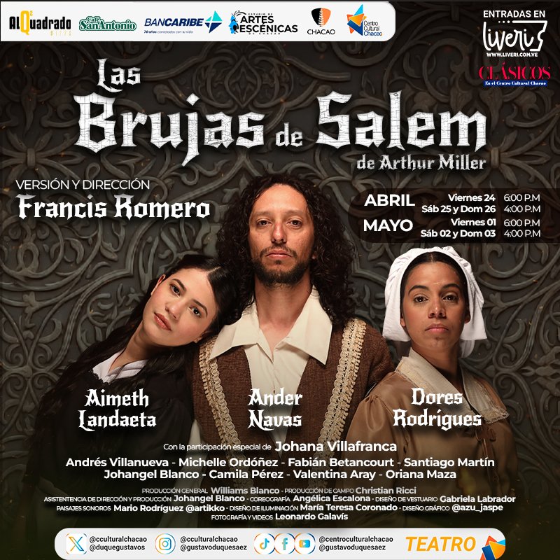 El Centro Cultural Chacao, consolidado como uno de los epicentros artísticos más vibrantes del país, se prepara para un estreno de alto impacto: «Las Brujas de Salem», la obra maestra de Arthur Miller. Esta temporada se llevará a cabo en la atmósfera íntima de la Sala La Viga del 1 al 3 de mayo. Los horarios de las funciones están pautados para el viernes 1° a las 6:00 p.m., mientras que el sábado 2 y el domingo 3, será a las 4:00 p.m. Las entradas ya se encuentran disponibles a través de la plataforma www.liveri.com.ve,, en las taquillas del teatro, con un costo de 10$ para el público general y una tarifa especial de 5$ para estudiantes (esta última disponible únicamente en taquilla).
