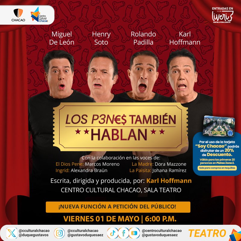 La Sala Teatro del Centro Cultural Chacao se prepara para una de las propuestas más audaces y esperadas de la temporada: «Los Penes También Hablan», una pieza escrita, producida y dirigida por el primer actor Karl Hoffmann, esta obra no es sólo una comedia, es un ejercicio de honestidad masculina que promete desvestir prejuicios a través del humor.