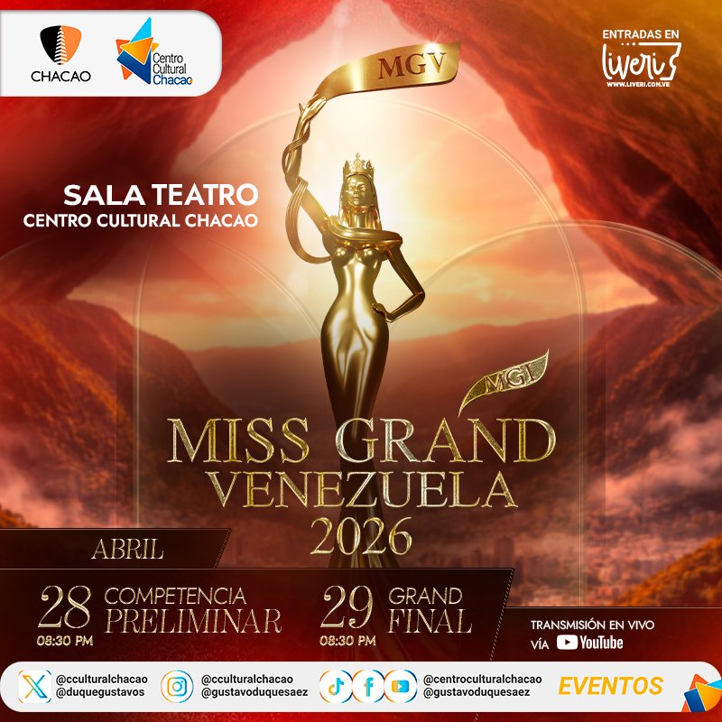La Organización Miss Grand Venezuela, liderada por Jacqueline Aguilera (Miss Mundo 1995) y Esteban Velásquez, celebrará la Gala Preliminar y Gala Final del certamen , este 28 y 29 de abril, en el gran escenario del Centro Cultural Chacao, para elegir a la nueva soberana que representará al país en el Miss Grand International en la India, además de gestionar la participación de las delegadas venezolanas en los certámenes Miss Charm, Reinado Internacional del Café y Reina Hispanoamericana.