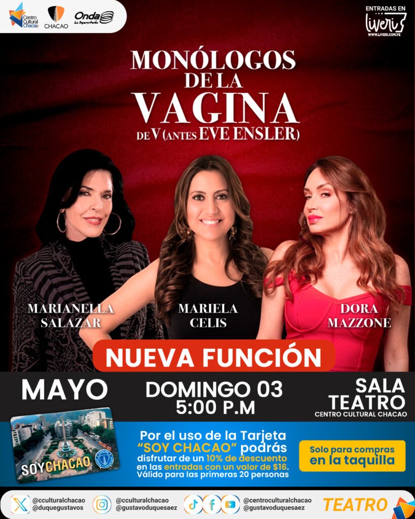 La aclamada pieza teatral «Monólogos de la Vagina» de la escritora y activista estadounidense Eve Ensler, cumple 25 años en cartelera y lo celebrará con una única función el 03 de mayo a las 5:00 p.m., en las tablas del Centro Cultural Chacao. Con las interpretaciones de las reconocidas actrices Dora Mazzone, Marianella Salazar y Mariela Celis.