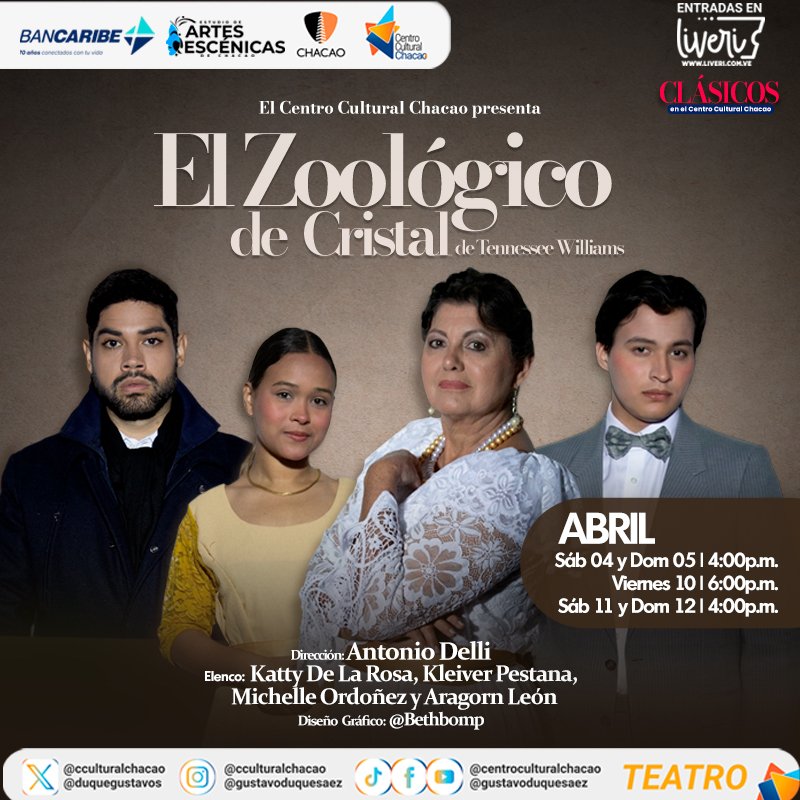 El Estudio de Artes Escénicas de Chacao y Bancaribe Cooltural anuncian el estreno de «El Zoológico de Cristal», la emblemática obra de Tennessee Williams, que se presentará en el Centro Cultural Chacao del 04 al 12 de abril bajo la dirección de Antonio Delli. Las funciones se llevarán a cabo los días sábado 04 y domingo 05 de abril a las 4:00 p.m.; el viernes 10 de abril a las 6:00 p.m.; y el sábado 11 y domingo 12 de abril a las 4:00 p.m. Las entradas tienen un costo de 10$, para público general y una tarifa especial de 5$ para estudiantes (disponible sólo en taquilla), y pueden adquirirse a través de la plataforma www.liveri.com.ve.