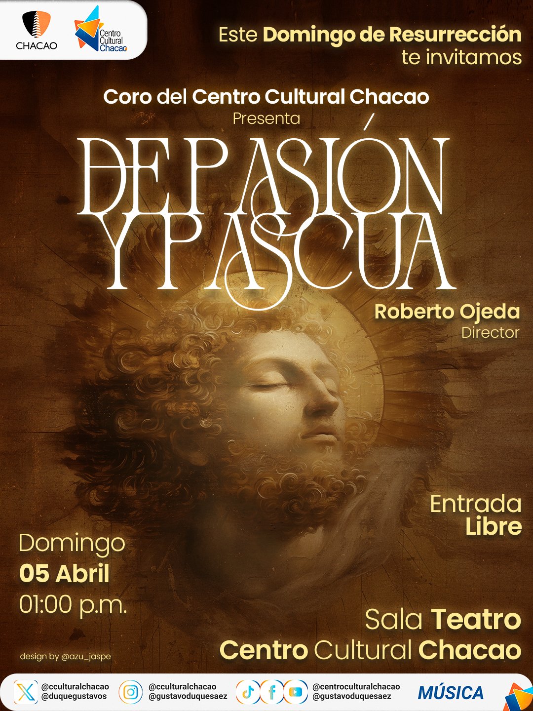 En el marco de la conmemoración de la Semana Mayor, el Centro Cultural Chacao se complace en invitar al público en general a disfrutar de un emotivo concierto titulado «De Pasión y Pascua», a cargo de su propia agrupación coral. Este encuentro musical único tendrá lugar el próximo domingo 05 de abril a la 1:00 p.m. en la Sala Teatro. Bajo la batuta del reconocido profesor Roberto Ojeda, el Coro del Centro Cultural Chacao interpretará una interesante y cuidada selección de música sacra, ofreciendo un espacio de reflexión y conexión espiritual a través del arte vocal. La entrada para este evento es libre.