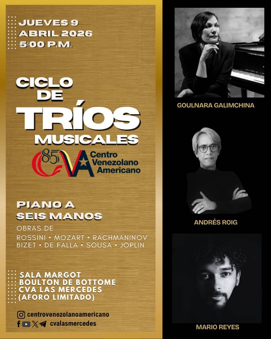 El jueves 9 de abril de 2026, a las 5:00 p.m., continuará el Ciclo de Tríos Musicales en la Sala Margot Boulton de Bottome del CVA, con un concierto de piano a seis manos a cargo de los pianistas Goulnara Galimchina, Andrés Roig y Mario Reyes, en el marco de la programación cultural que desarrolla el Centro Venezolano Americano para celebrar su 85 aniversario.