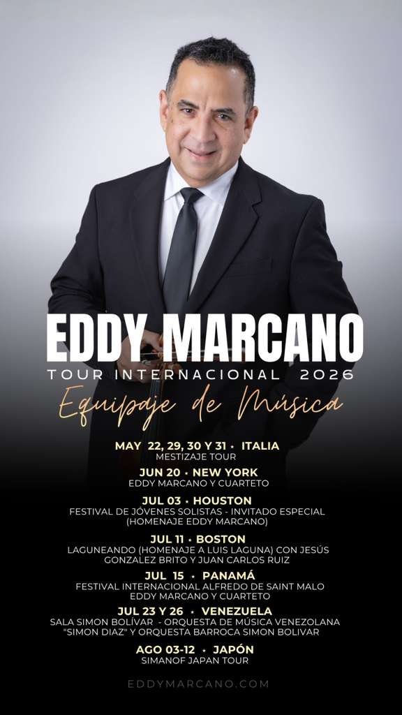 El violinista y director de orquesta venezolano, Eddy Marcano, realiza una gira que incluye 3 continentes, 6 países y 10 ciudades. Viene de tocar en Brasil y en mayo viajará al viejo continente, para realizar un tour de 4 fechas por Italia, con motivo del lanzamiento del disco Mestizaje. A principios de julio se presentará en Houston, Nueva York y Boston (EEUU). Después se traslada a Latinoamérica para dar un concierto en Panamá con su cuarteto acústico, en un importante festival, y a finales de ese mes, regresará a Venezuela para dirigir a la Orquesta Simón Díaz y a la Orquesta Barroca Simón Bolívar, reencontrándose con El Sistema. Cerrará el recorrido en agosto, pisando el territorio asiático, tomando la batuta para dirigir dos conciertos en Japón.