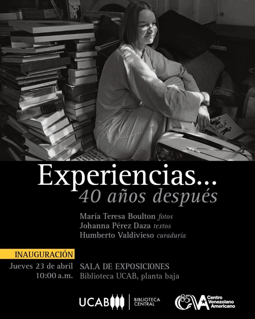 El jueves 23 de abril de 2026 a las 10:00 a.m., será inaugurada en la Sala de Exposiciones de la Biblioteca UCAB, en alianza con el Centro Venezolano Americano, la exposición “Experiencias… 40 años después”, una muestra que bajo la curaduría de Humberto Valdivieso reúne una selección de fotografías realizadas por la fotógrafa venezolana María Teresa Boulton, acompañadas por textos de Johanna Pérez Daza.