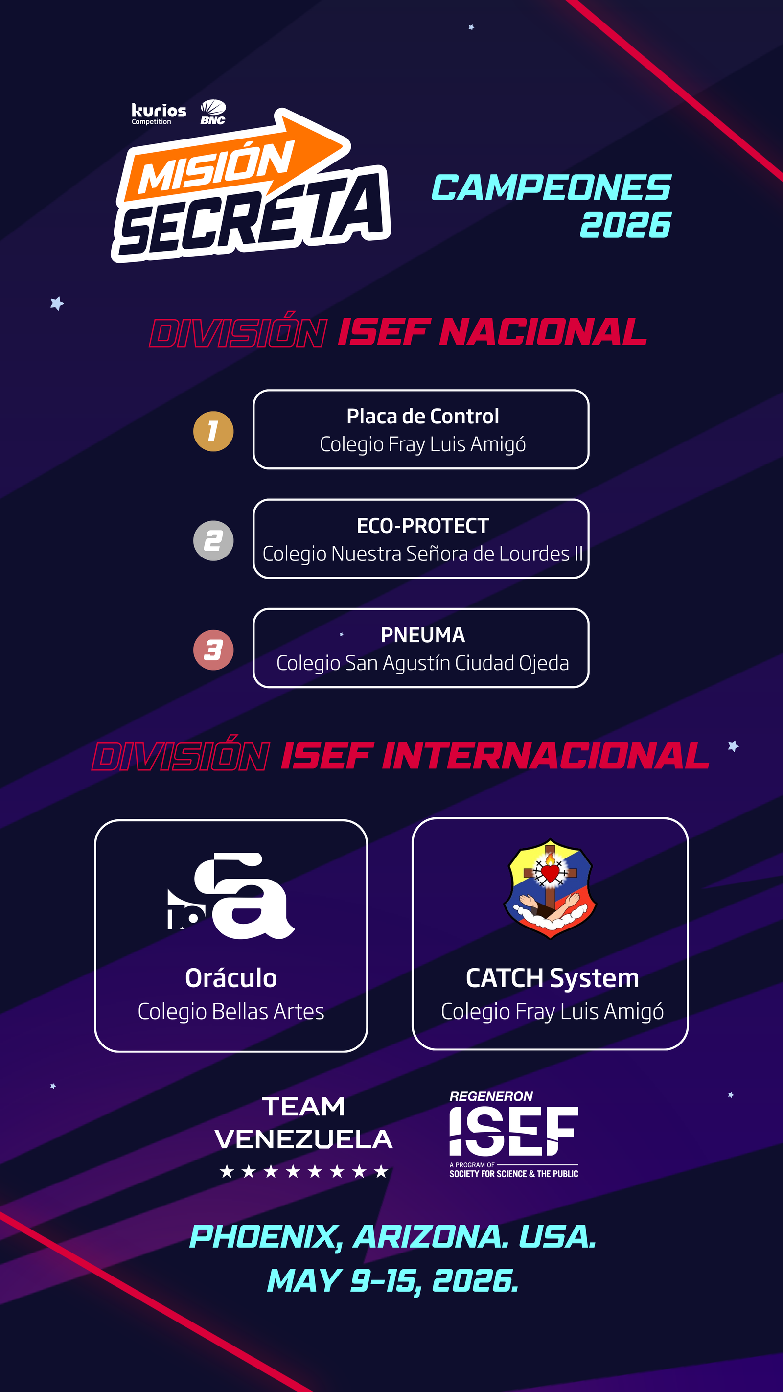 Ahora, la mirada se proyecta hacia el escenario internacional. Proyectos como Oráculo (Colegio Bellas Artes) y CATCH System (Colegio Fray Luis Amigó) representarán a Venezuela en Phoenix, del 9 al 15 de mayo de 2026, llevando consigo no solo propuestas tecnológicas, sino también historias de esfuerzo colectivo.