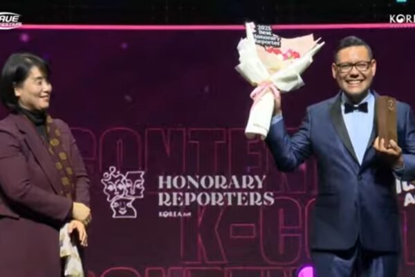 Alirio recibiendo el premio junto a la representante del Ministerio de Cultura, Deportes y…